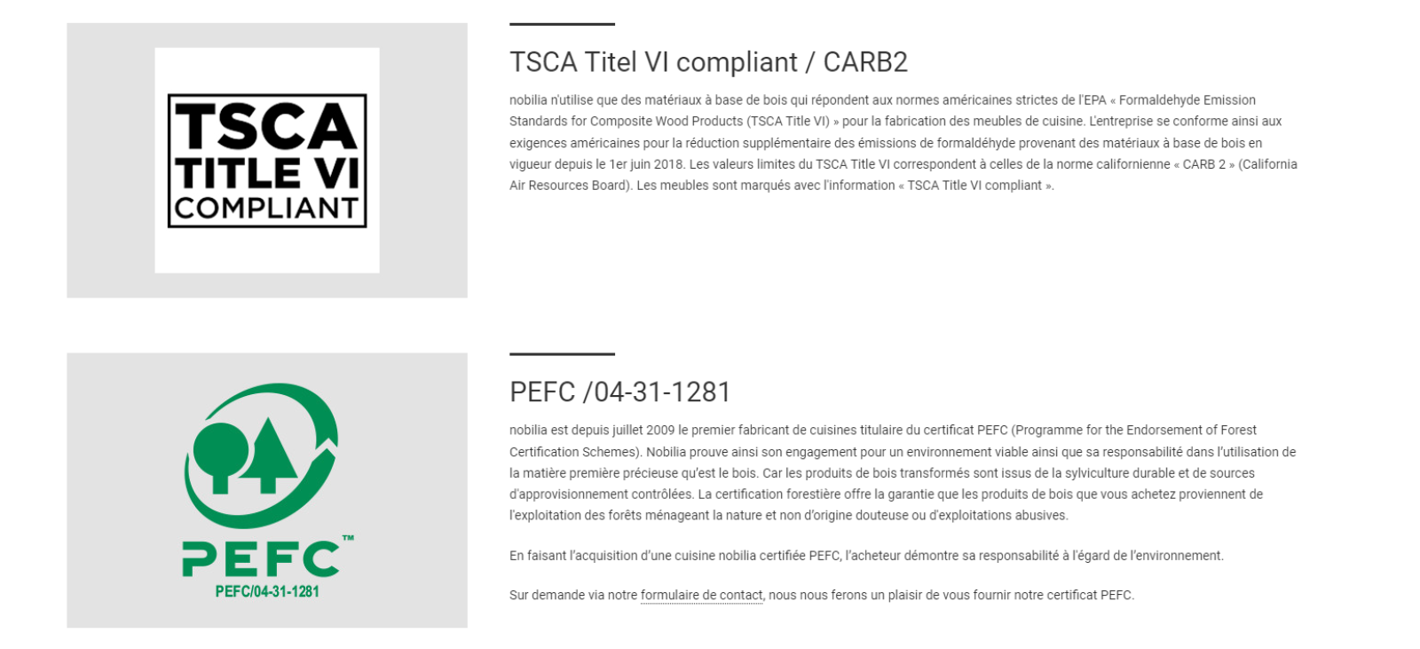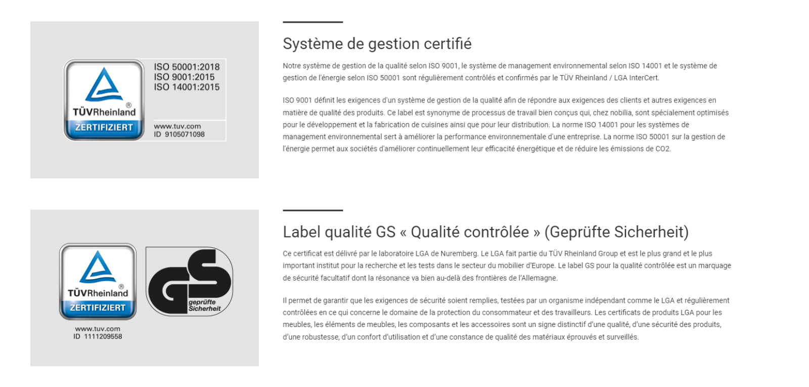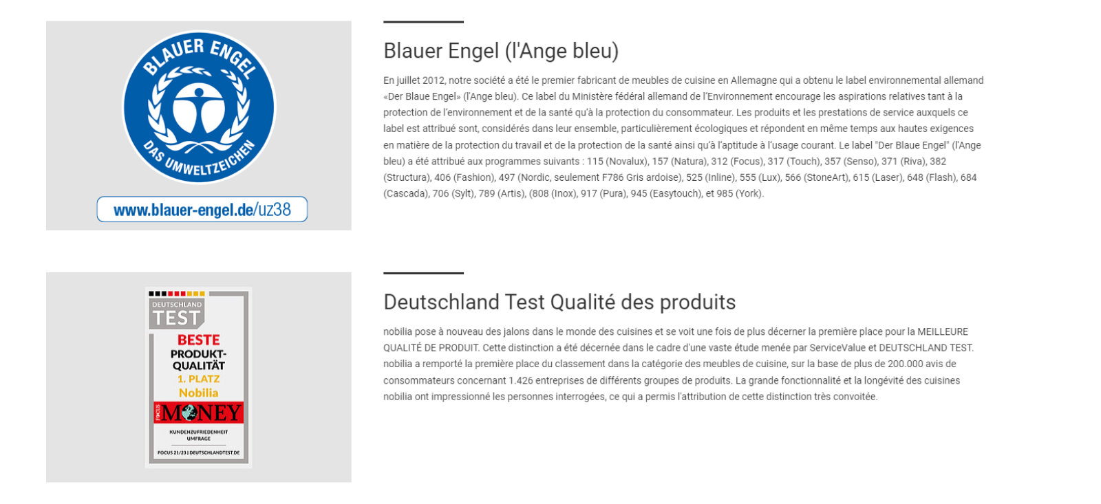 Notre fabricant allemand au cœur de cette réputation, se distingue par son approche axée sur la qualité. Chaque cuisine montée en usine reflète un engagement sans faille envers la satisfaction du client, offrant ainsi des espaces bien pensés et adaptés à chaque style de vie. Grâce à une visite sur le site de Nobilia, il est facile de comprendre comment l'entreprise atteint ces standards élevés, notamment à travers une multitude de labels de qualité qui attestent de son dévouement à l'excellence.